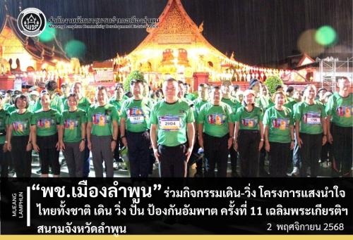 สำนักงานสาธารณสุขจังหวัดลำพูน ร่วมกับสำนักงานจังหวัดลำพูน สำนักงานท่องเที่ยวและกีฬาจังหวัดลำพูน และหน่วยงานที่เกี่ยวข้อง ได้ร่วมกันจัดกิจกรรม "โครงการแสงนำใจไทยทั้งชาติ เดิน วิ่ง ปั่น ป้องกันอัมพาต ครั้งที่ 11 เฉลิมพระเกียรติ" ในพื้นที่จังหวัดลำพูนขึ้น ระหว่างวันที่ 27 ตุลาคม ถึง 2 พฤศจิกายน 2568 พร้อมกับจังหวัดอื่นๆ ทั่วประเทศ มีวัตถุประสงค์เพื่อเฉลิมพระเกียรติ พระบาทสมเด็จพระเจ้าอยู่หัวและสมเด็จพระนางเจ้าฯ พระบรมราชินี ที่ทรงเป็นดั่งแสงนำใจ และแบบอย่างของประชาชนในการรักษาสุขภาพ และเพื่อส่งเสริมกิจกรรมการป้องกันโรคหลอดเลือดสมอง โดยให้ประชาชนออกกำลังกายอย่างง่ายๆ เช่น เดิน วิ่ง ปั่นจักรยาน เพื่อให้มีสุขภาพดี ห่างไกลโรค ซึ่งในวันนี้ มีจำนวนผู้สมัครเข้าร่วมกิจกรรมสนามจังหวัดลำพูน จำนวนกว่า 3,082 คน / ระยะทาง 3.5 กิโลเมตร รายได้จากการสมัครกิจกรรม นำเข้ามูลนิธิศูนย์โรคหลอดเลือดสมองศิริราช คณะแพทย์ศิริราชพยาบาล มูลนิธิโรงพยาบาลสมเด็จพระยุพราช และสนับสนุนการจัดกิจกรรมของระดับจังหวัดต่อไป
