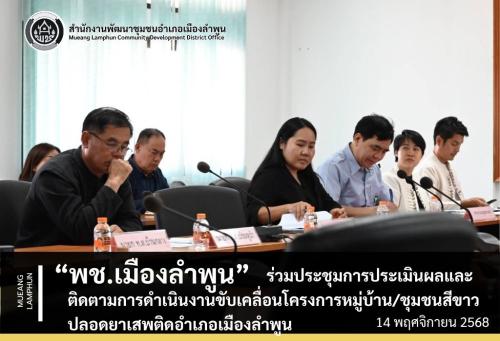 วันศุกร์ที่ 14 พฤศจิกายน 2568 เวลา 13.30 น. ณ ห้องประชุมบัวขาว ชั้น 2 อาคารที่ว่าการอำเภอเมืองลำพูน นางสาวสุพัตรา วันนู พัฒนาการอำเภอเมืองลำพูน เข้าร่วมการประเมินผลและติดตามการดำเนินงานขับเคลื่อนโครงการหมู่บ้าน/ชุมชนสีขาว ปลอดยาเสพติดอำเภอเมืองลำพูน โดยมีนายอำนาจ พัวตะนะ เป็นประธานการประเมินผลฯ พร้อมด้วย ปลัดอำเภอ เจ้าหน้าที่ตำรวจ กำนัน ผู้ใหญ่บ้าน เข้าร่วมการประเมินผลฯ ในครั้งนี้