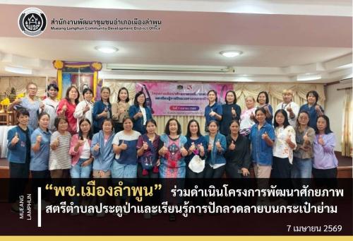 วันอังคารที่ 7 เมษายน 2569 เวลา 09.00 น. ณ ห้องประชุมเทศบาลตำบลประตูป่า อำเภอเมืองลำพูน จังหวัดลำพูน สำนักงานพัฒนาชุมชนอำเภอเมืองลำพูน ร่วมกับคณะกรรมการพัฒนาสตรี และคณะทำงานขับเคลื่อนกองทุนพัฒนาบทบาทสตรี ดำเนินโครงการพัฒนาศักยภาพสตรีตำบลประตูป่าและเรียนรู้การปักลวดลายบนกระเป๋าย่าม มีผู้เข้าร่วมโครงการจำนวน 30 คน